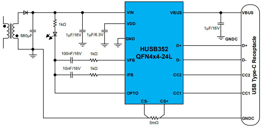 HUSB352是(shì)一(yī)款高(gāo)↑±¥集成、高(gāo)性能(néng)的(de)USB→≤≠βPDSource芯片,它集成了(le)一(yī)個(gè)低(dī≈€)RDSON的(de)N-MOSFET,支持18W~3δ λ↔6W功率輸出。HUSB352 符合Type-C2.1和¥←•(hé)USBPD3.1标準,支持PD3.0、P÷™σD2.0、PPS、QC2.0/QC3.0、FCP、AFC、BC1.2DCP、SCP$₹等協議(yì),支持3個(gè)具有(yǒu)可(kě)編程電(diàn)壓和(hé)電(diδΩ&àn)流的(de)FPDO和(hé)2個(gè)APDO。它集成了(le)過壓保護(OVP&>γ)、欠壓保護(UVP)、欠壓鎖定(UVLO)、過流保護(OCP) 、快(kuài)速過流保護(✔δFOCP)和(hé)熱(rè)關斷(TS≤←D)等必需的(de)保護。HUSB352采用(yòng)QFN-24L(4mmx4mm)的(↔&'de)封裝形式,有(yǒu)利于小(xiǎo)型化(huà)快(kuài)充電(di<₹àn)源設計(jì),适用(yòng)于各類AC↔♦-DC電(diàn)源适配器(qì)、車(chē)載充電(diàn)器(qì)等應用(₩↓yòng)。