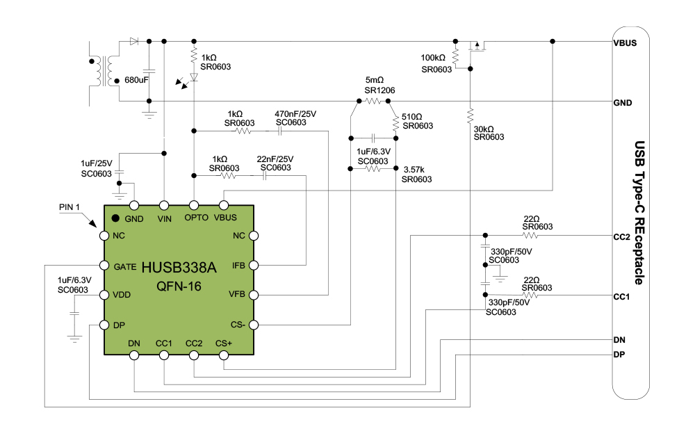 HUSB338A是(shì)一(yī)顆高(gāo)性λ®Ω能(néng)、高(gāo)集成度的(de)US♥₽πB Type-C Power Delivery (電(diàn)力傳輸)控制(αφzhì)器(qì)。它集成了(le)PD3.0、PD2.0、QC2.0/QC3. ×0和(hé)BC1.2 DCP等協議(yì)。HUSB338A适用(yòng)于電(diàn€✘↔)源适配器(qì)、手機(jī)充電(diàn) σ器(qì)、車(chē)載充電(diàn)器(qì)和(hé)移動電(diàn)源等應用(yòng×σ)場(chǎng)合。HUSB338A支持QFN-16L封裝形式,有(yǒu)兩種規格:規格一(↑ε λyī)是(shì)HUSB338A_A000B,适用(yòng)于旅充應用(yò ₹ ng),18W功率等級,支持PD3.0 5V3A、9V2A'★∑'、12V1.5A,QC2.0/3.0和(hé)BC1.2 DCP輸出。規格二是→"§(shì)HUSB338A_B000B,适用(yòng)于車(c™♥hē)充應用(yòng),18W功率等級,支持PD3.0 5V3A、9V2↕♥™£A和(hé)BC1.2 DCP輸出。HUSB338A采用(yòng)4mm x 4mm γ QFN-16L封裝。