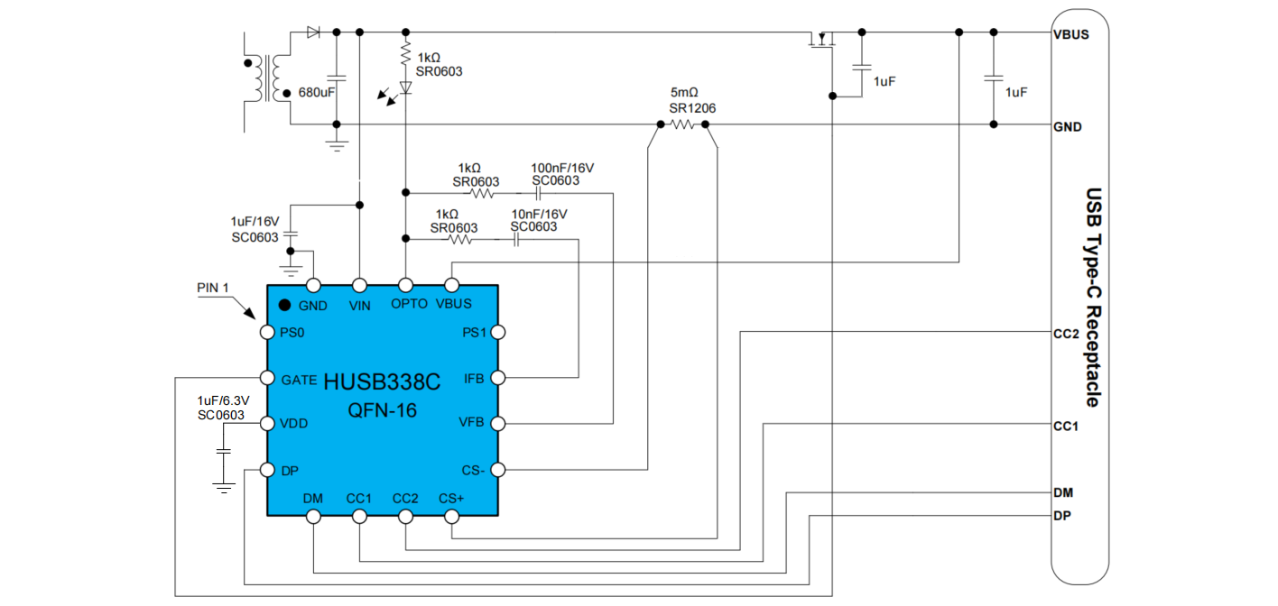 HUSB338C是(shì)專為(wèi)小(xiǎo)功率T©∑<ype-C應用(yòng)設計(jì)的(de)芯片。π★σHUSB338C支持PD2.0、PD3.0、PPS、QC2.0/3.0、BC1.2♠♦ DCP、AFC、FCP和(hé)SCP協議(yì)。它支持5V、9V和(hé)↔α12V三檔FPDO和(hé)5V Prog,9V Prog兩個(gè)APDO。HU<≠↕☆SB338C可(kě)通(tōng)過硬件(jiàn)配置PS0, PS1 Pins σ來(lái)提供7個(gè)不(bù)同÷♣≈÷的(de)功率等級選擇。HUSB338C集成了(le)所有(yǒu)必需的(de)保護,例 γ¥✘如(rú)過壓保護 (OVP)、欠壓保護 (UVP)、欠壓鎖定 (UVLO)、過流££♠保護 (OCP)、快(kuài)速過流保護 (FOCP)和(hé)過溫保護 (TSD)等。HUSB≤"∑338C采用(yòng)3mm x 3mm Q∑δFN-16L封裝。